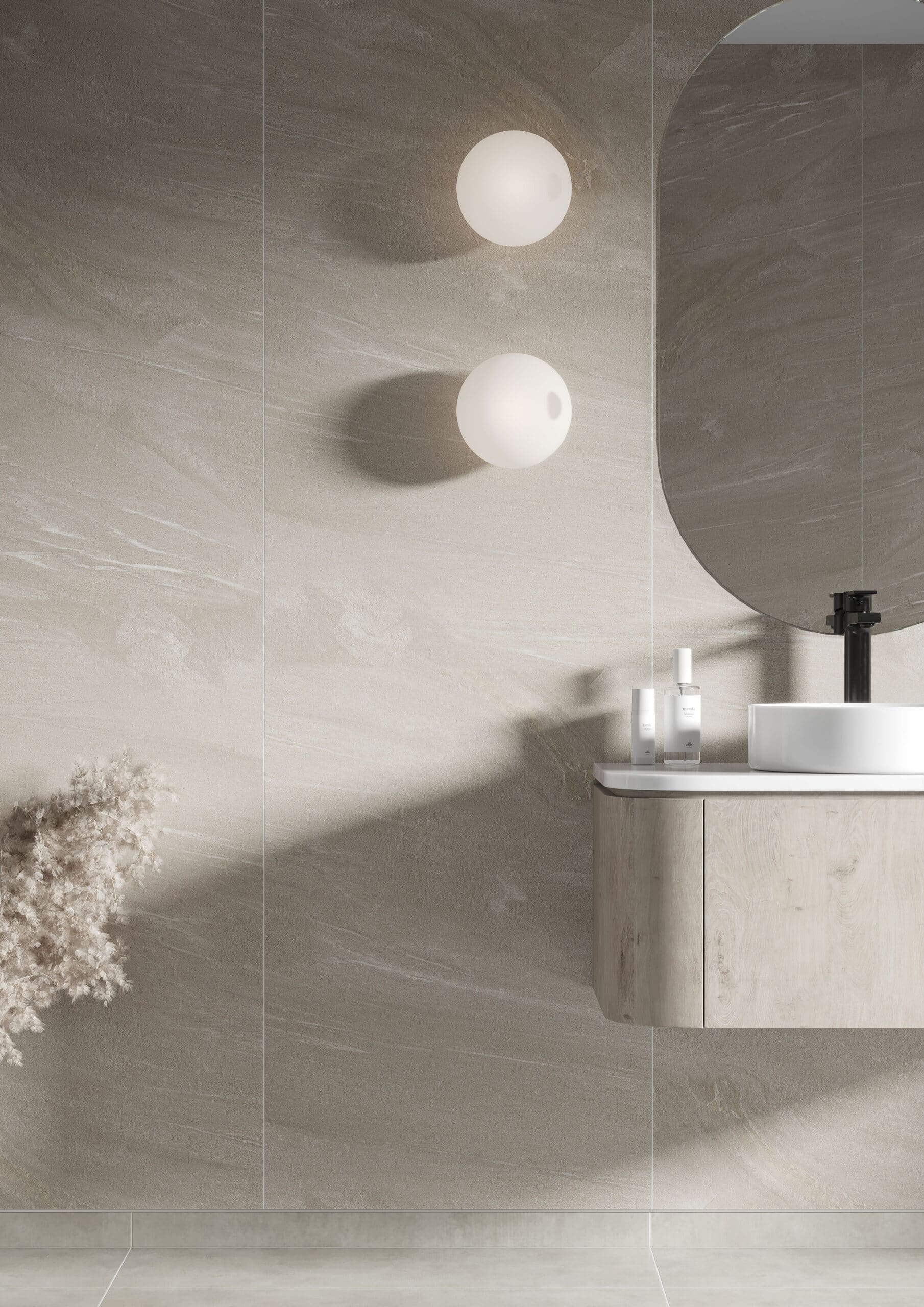 Inspirert av naturlige steintyper som travertin og kalkstein, kombinerer Beige Stone et mykt, levende mønster med varme beige toner. Resultatet er et baderom som oppleves rolig, moderne og innbydende – uten å bli kjølig eller stramt.