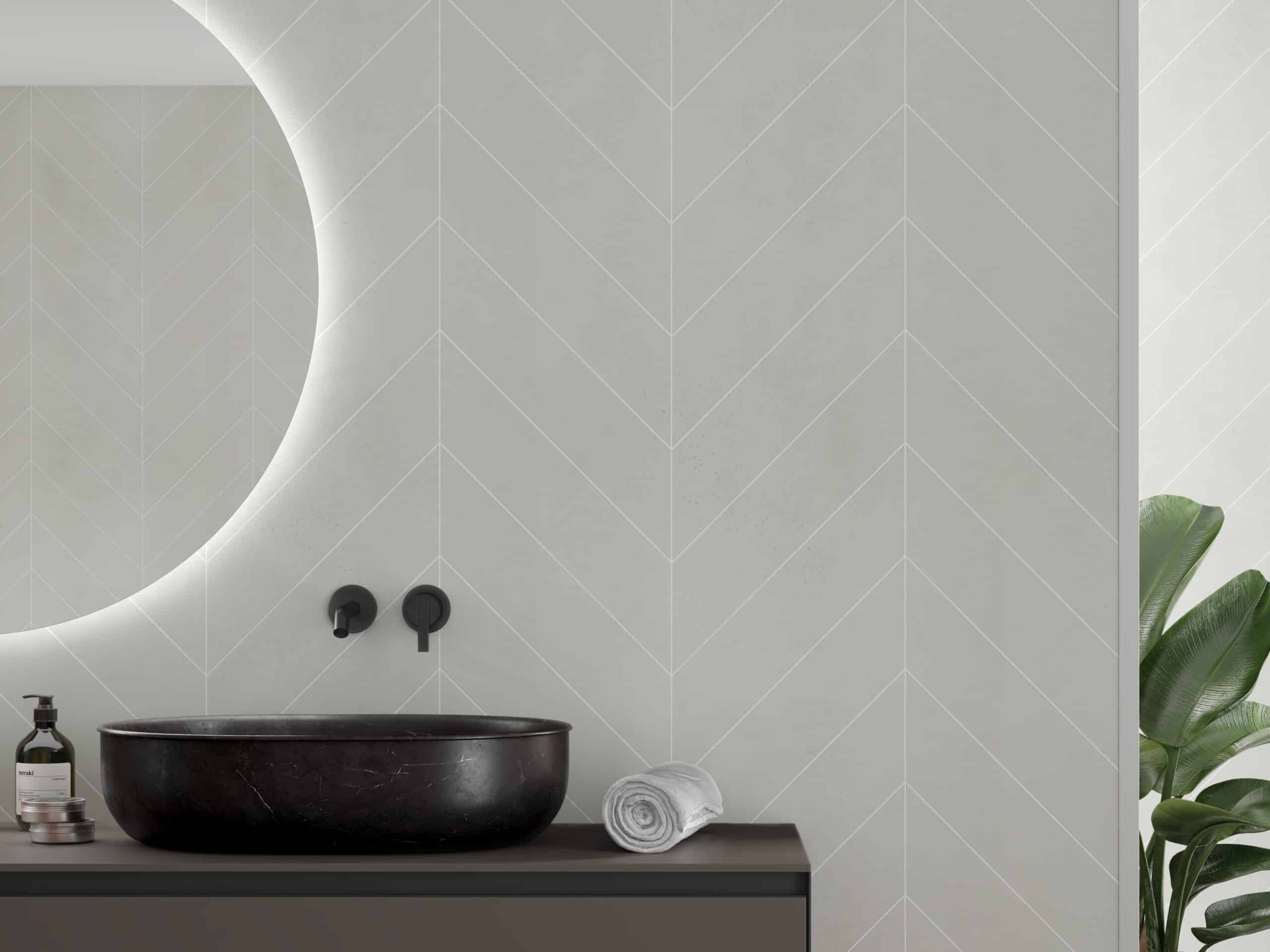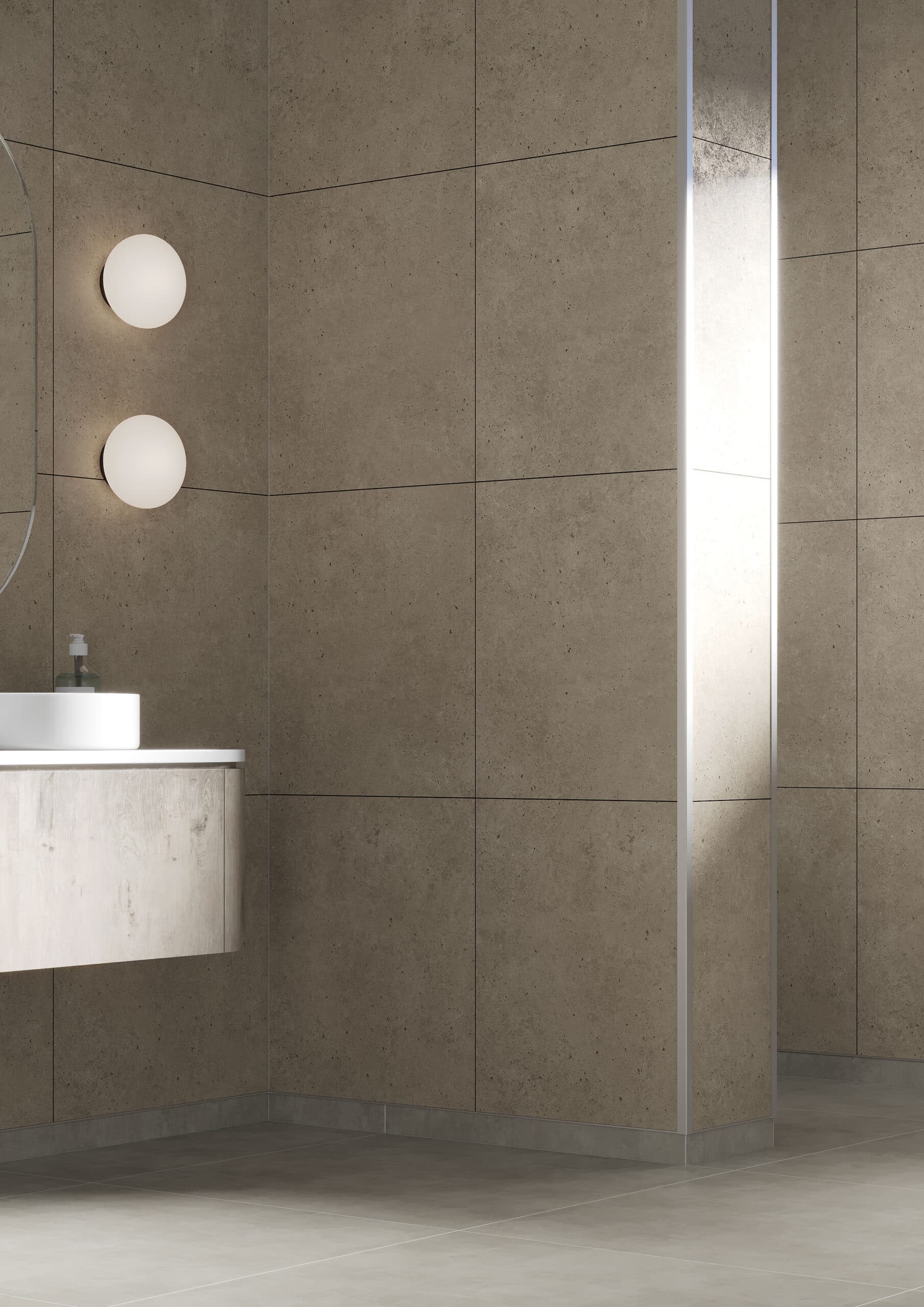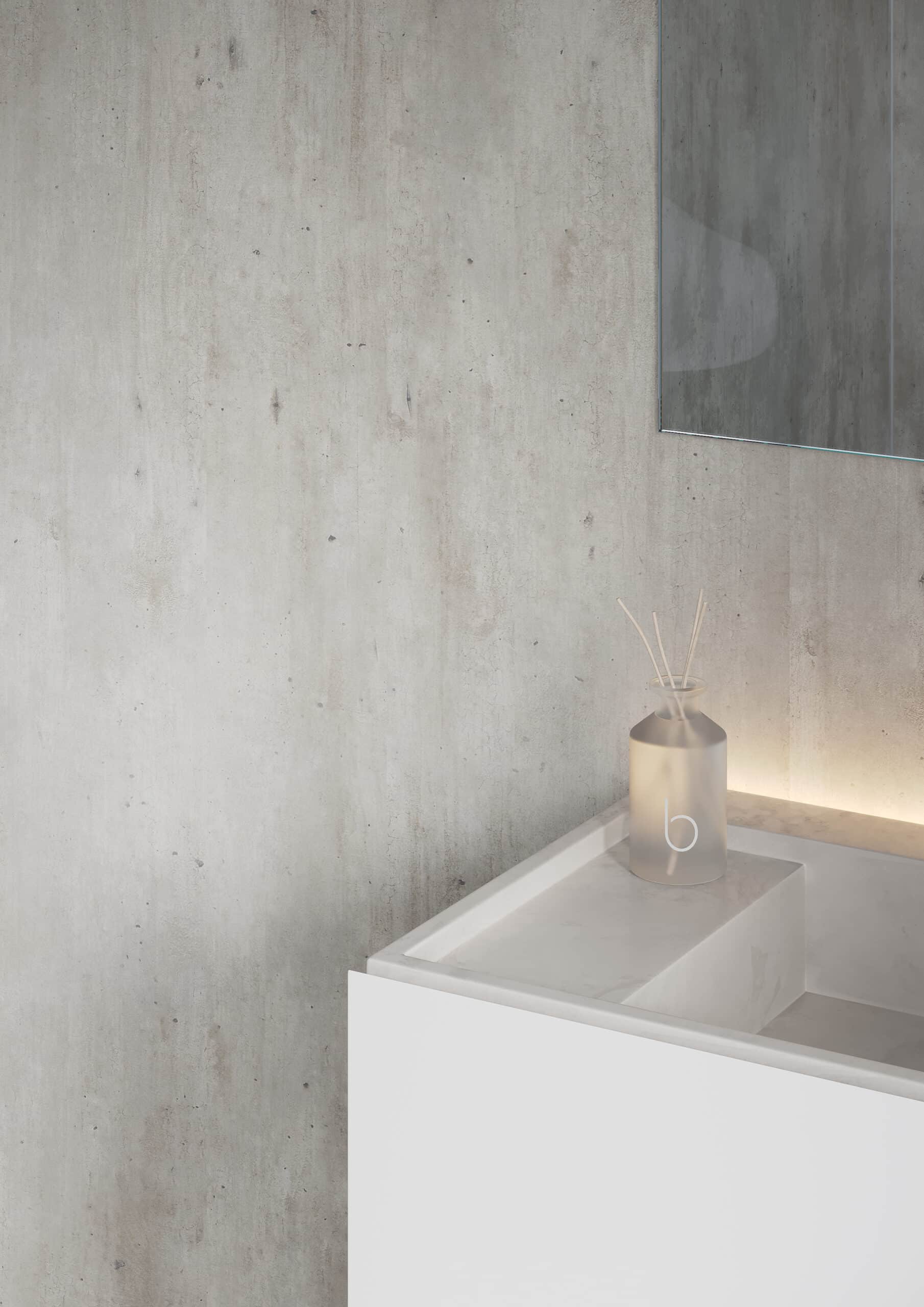 Dekorer som Grey Cement og Soft Cement skaper et lyst og balansert uttrykk. De fungerer som en rolig base i minimalistiske baderom med rene linjer og dempede materialer.
