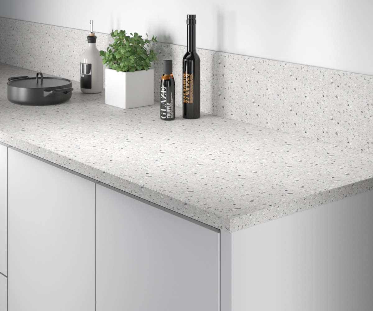 Gjør kjøkkenet ditt fresht med denne grå terrazzo-dekoren. Moderne og lett og kombinere med andre elementer.