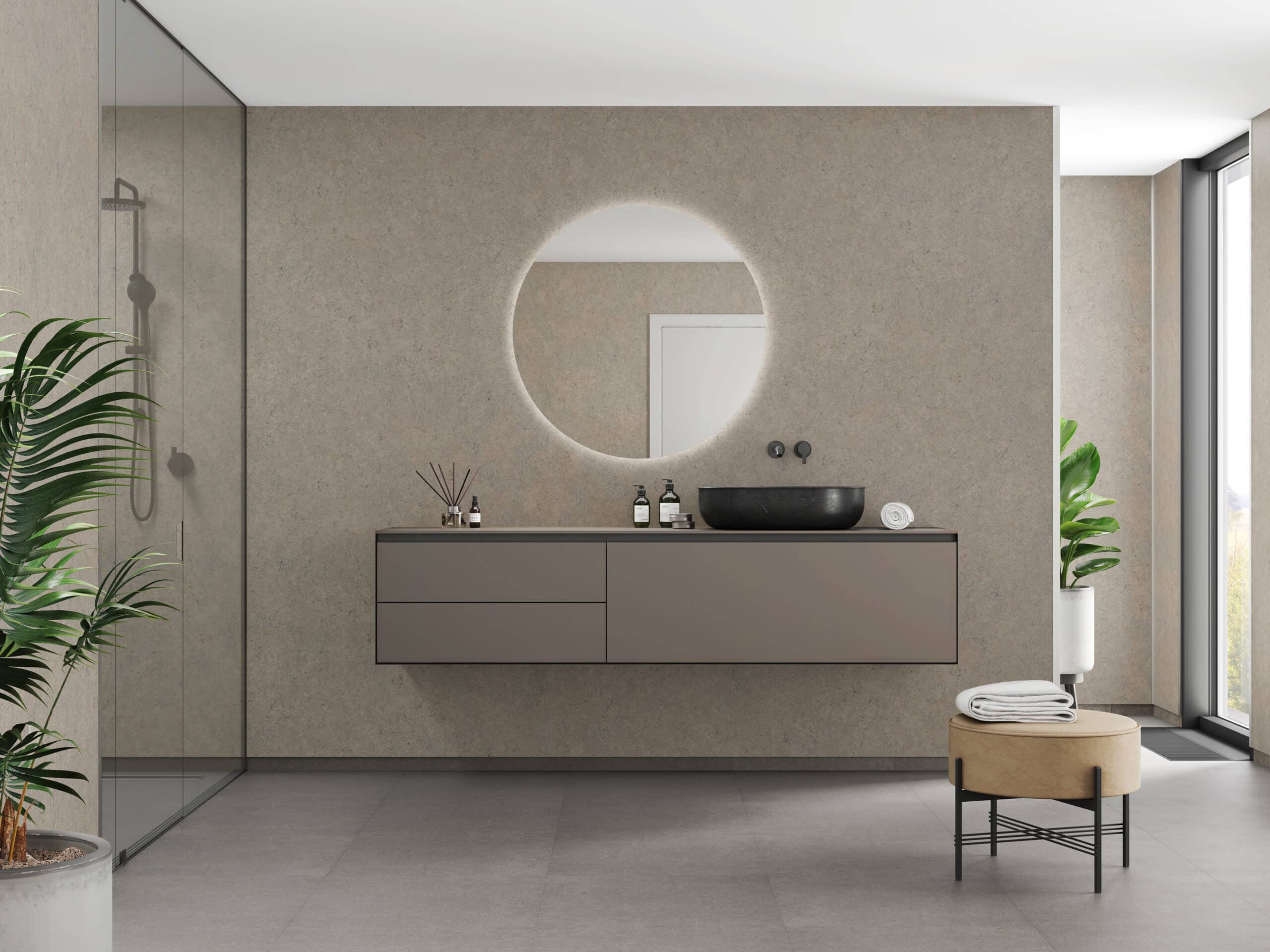 Dekoren tilfører rommet varme og dybde, samtidig som den skaper en rolig og naturlig atmosfære. Rustic Granite passer godt i moderne baderom hvor naturmaterialer, jordtoner og taktilitet står i fokus.